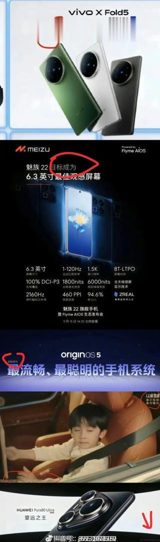 从万志强转载的微博长图可见,魅族22手机的"目标成为"与其他文字大小相同,但进行了弱化处理;相比之下,其他多家厂商的"目标"相关表述则采用更小字号的形式呈现。这一差异反映了不同厂商在遵循法规和平衡宣传效果方面的不同策略。
