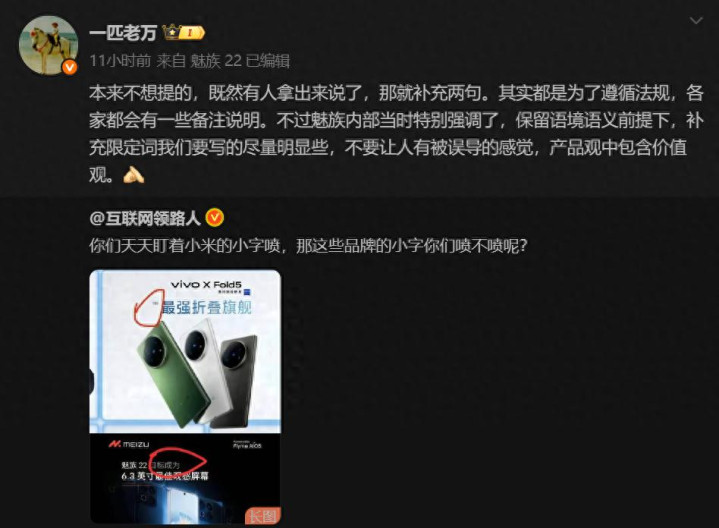 星纪魅族集团中国区CMO万志强在微博对此事作出回应。他表示:"本来不想提的,既然有人拿出来说了,那就补充两句。其实都是为了遵循法规,各家都会有一些备注说明。"万志强进一步透露,魅族内部当时特别强调了,"保留语境语义前提下,补充限定词我们要写的尽量明显些,不要让人有被误导的感觉,产品观中包含价值观"。